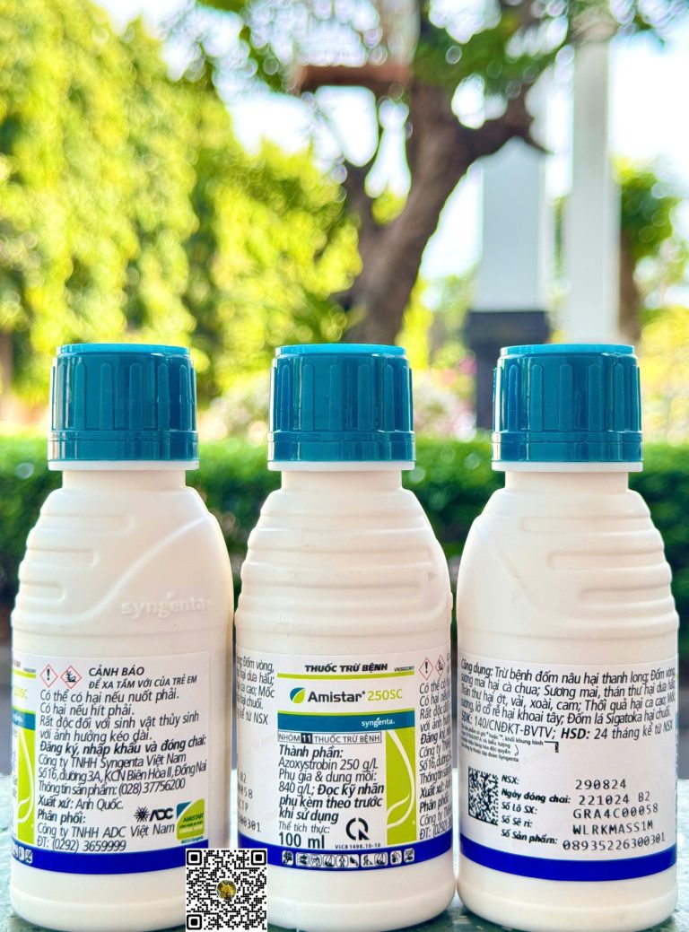 Amistar 250SC – Thuốc trừ bệnh thế hệ mới có nguồn gốc từ thiên nhiên phổ rộng, đặc trị thán thư xoài và nhiều loại bệnh khác – Tiêu diệt nấm bệnh trước khi xâm nhiễm vào cây trồng, ngăn chặn nấm bệnh tiết ra độc tố gây hại cho cây, bông, trái – Giúp tăng cường năng suất và phẩm chất trái; giúp trái lên phẩm sáng đẹp, không cần bao trái; kéo dài thời gian bảo quản sau thu hoạch HDSD : Liều lượng: 0,3 – 0,4 lít/ha Cách pha: 60 – 80 ml/100 lít nước (hoặc 5 – 7 ml/bình 8 lít) Lưu ý : Phun phòng hay khi bệnh chớm xuất hiện Rất ít ảnh hưởng đến côn trùng có ích giúp thụ phấn cho xoài Rất an toàn cho bông xoài, kể cả phun lúc hoa nở Lượng nước phun: 500 – 600 lít/ha Phun ướt đều tán lá