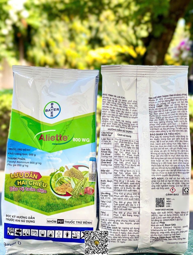 ALiette 800WG là thuốc – Đặc trị cháy lá vi khuẩn. – Thuốc duy nhất lưu dẫn 2 chiều. – Phun 1 lần trước khi bệnh xuất hiện – Kích thích lúa tiết kháng thể tiêu diệt vi khuẩn. HDSD :  Cây trồng: Lúa Loại bệnh: Cháy lá vi khuẩn Liều lượng: Pha 50 g/16 L nước (1 kg/ha) Phun sớm giai đoạn lúa làm đòng (40–50 NSS) Phun 320 lít nước/ha Cây trồng: Tiêu Loại bệnh: Chết nhanh (thối gốc) Liều lượng: 40 g/16 L nước, phun đều trên lá Phun 1 lần/tháng trong mùa mưa Cây trồng: Dưa hấu, Khoai tây Loại bệnh: Sương mai Liều lượng: 40 g/16 L nước (1 kg/ha) Lượng nước: 400 – 500 L/ha Cây trồng: Sầu riêng, Ca cao Loại bệnh: Thối trái, xì mủ Liều lượng: 32 g/16 L nước, phun ướt đều cây trồng khi bệnh xuất hiện