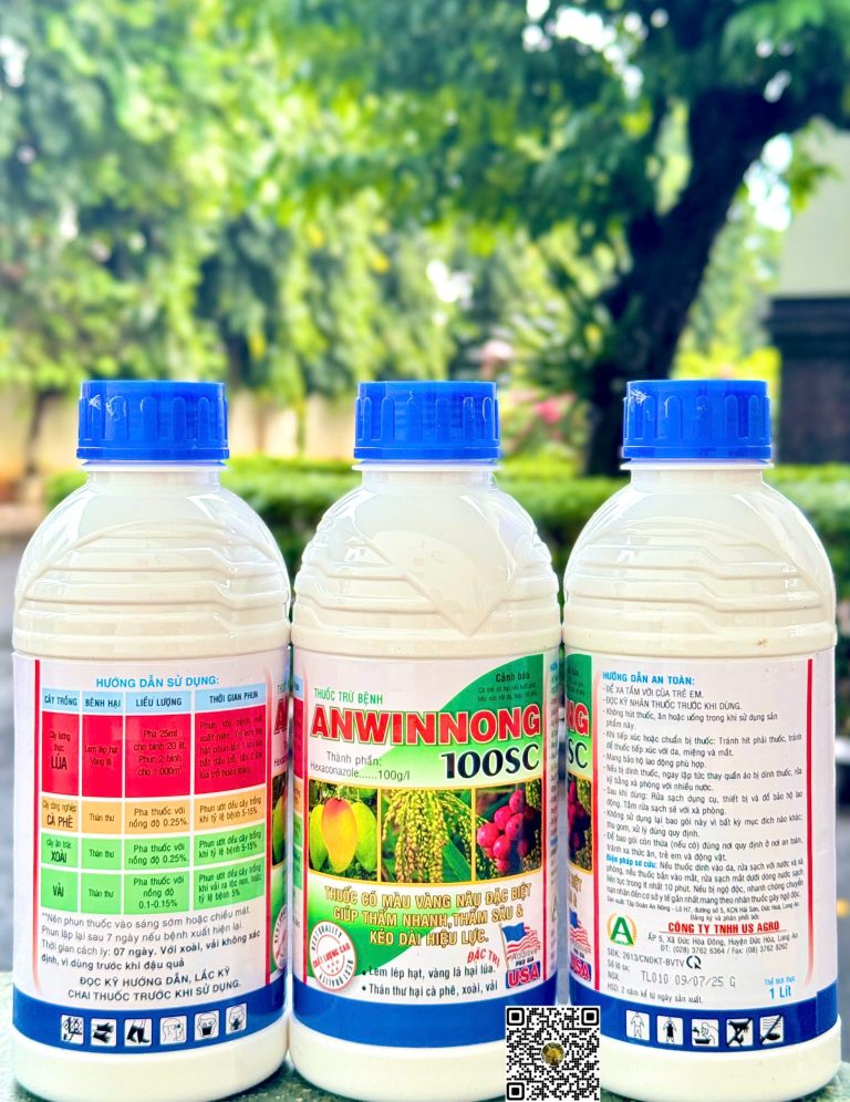 Anwinnong 100SC có màu vàng nâu đặc biệt giúp thấm nhanh, thấm sâu và kéo dài hiệu lực, đặc trị lem lép hại lúa, thán thư hại cà phê, xoài, vải.