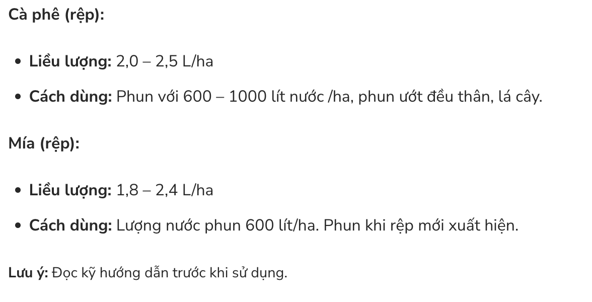 Thuốc có phổ tác động rất rộng, hiệu quả cao trừ nhiều loại côn trùng chích hút như: rệp sáp, rệp muội, bọ nhảy, bọ cánh tơ, bọ phấn, rầy xanh, bọ xít và nhện đậu đỗ, cây ăn quả, cây công nghiệp, lúa, ngô…
