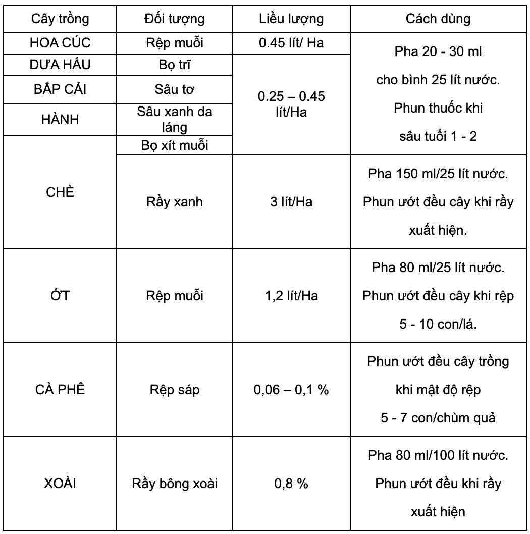 Có thể pha cùng với các loại thuốc trừ sâu, trừ bệnh khác, ngoại trừ các hoạt chất Propargite, Carbaryl, các hợp chất chứa lưu huỳnh, Chlorothalonil, dung dịch Bordeaux.