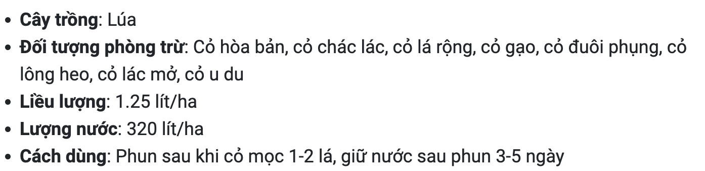 Là thuốc trừ cỏ hậu nảy mầm có tác dụng rộng, điệt trừ các loại cỏ thuộc nhóm hòa bản, chác lác và cỏ lá rộng