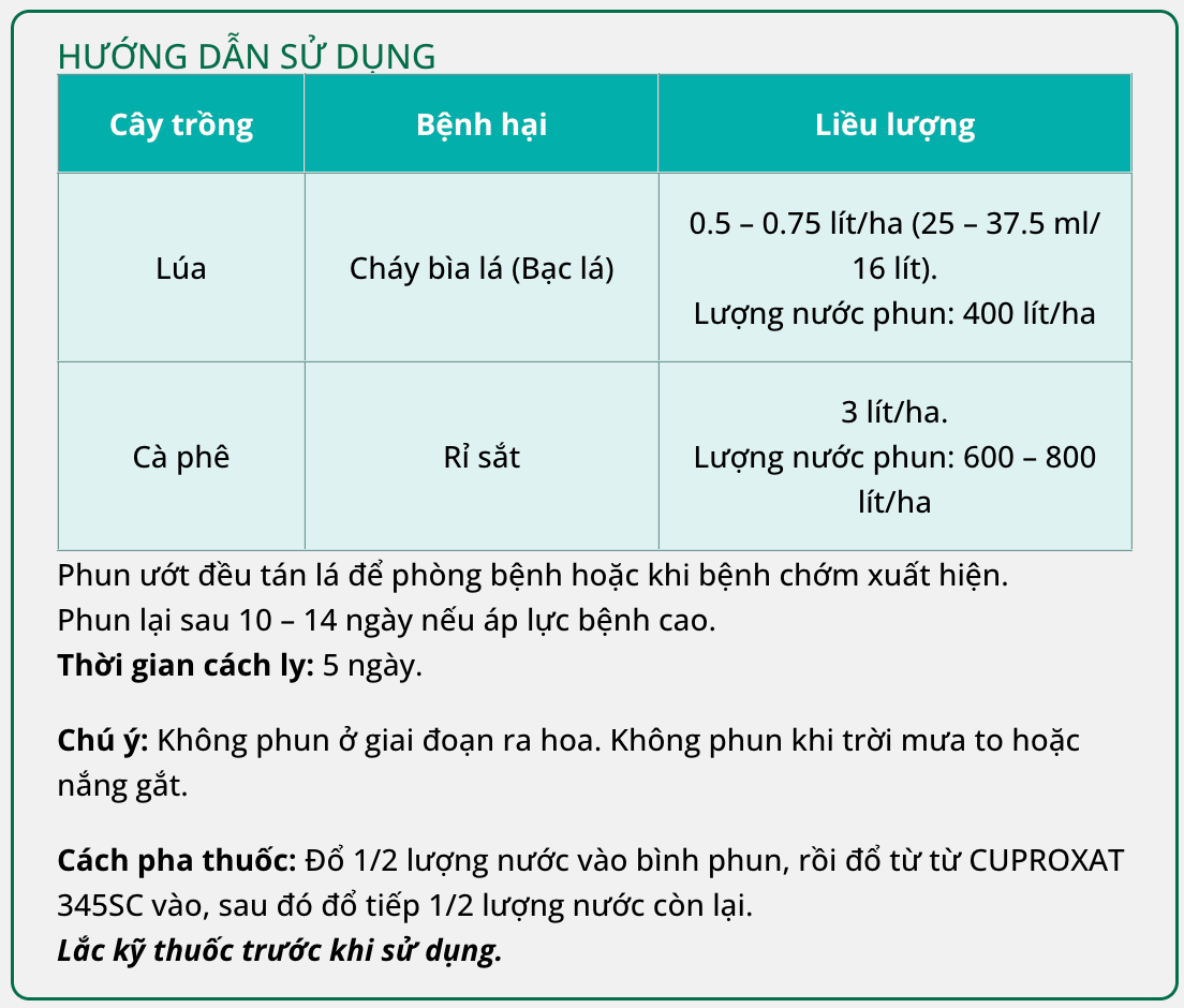 CUPROXAT 345SC – Thuốc trừ bệnh phổ tác dụng rộng, phòng trị được cả nấm và vi khuẩn hại cây trồng. Thuốc dạng lỏng tan hoàn toàn trong nước, có khả năng phân tán đều và bám dính tốt… dùng để trừ bệnh cháy bìa lá lúa, rỉ sắt hại cà phê.