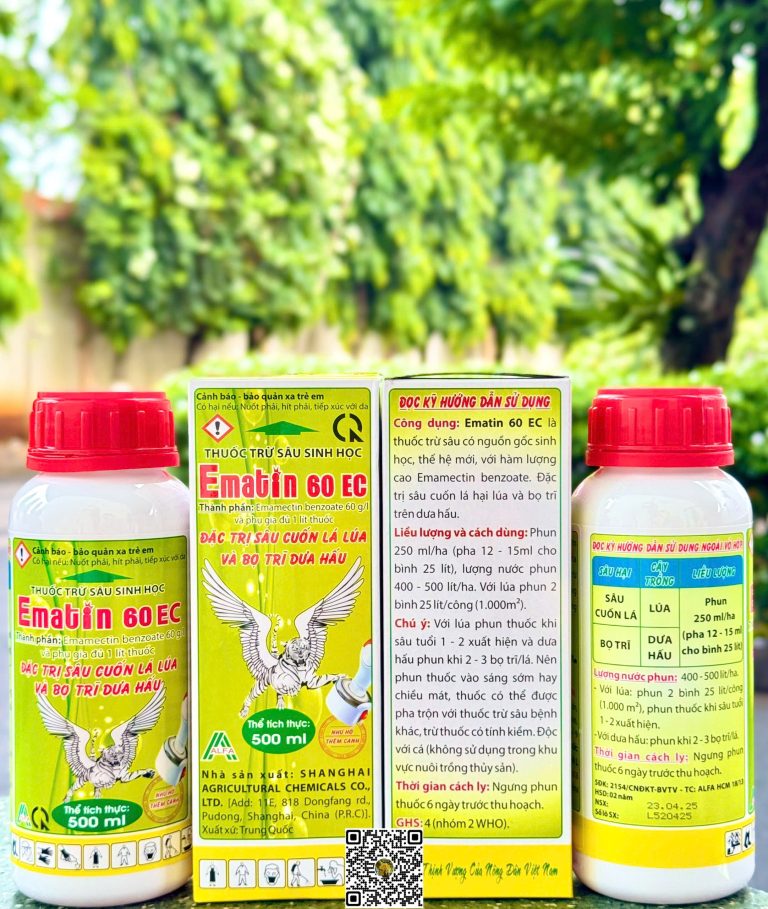 Ematin 60EC là thuốc trừ sâu có nguồn gốc sinh học, thế hệ mới với hàm lượng cao Emamectin benzoate. Đặc trị sâu cuốn lá hại lúa và bọ trĩ hại dưa hấu.