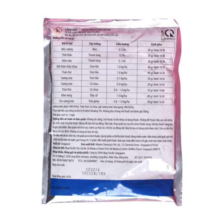 Hoạt chất chính: Azoxystrobin 60 g/kg + Dimethomorph 30 g/kg + Fosetyl aluminium 250 g/kg
