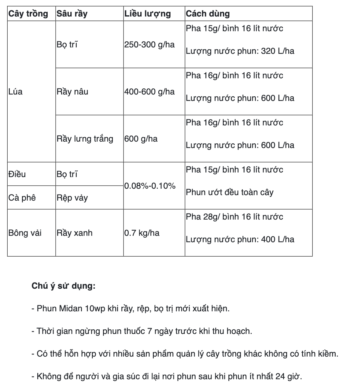 MIDAN 10WP có khả năng lưu dộng trông thân cây, hiệu lực phòng trừ cao và kéo dài. Không gây cháy lá, rụng hoa.