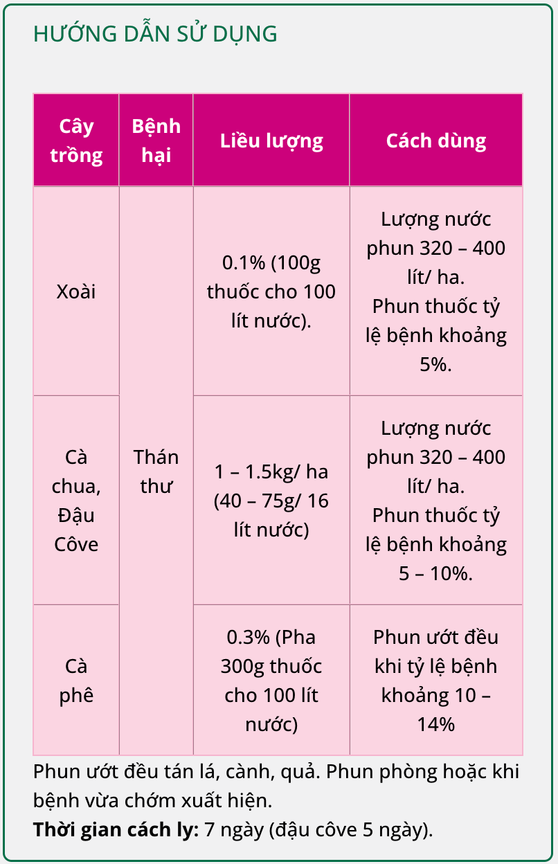 NOVA 70WP – Thuốc trừ bệnh phổ rộng trên nhiều loại cây trồng. Đặc biệt hiệu quả cao đối với bệnh thán thư xoài, bệnh thán thư cà phê gây hiện tượng khô cành, khô quả cà phê, thán thư đậu côve, cà chua.