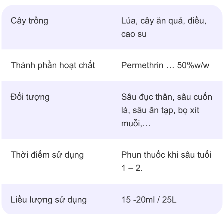 PERAN 50EC là sản phẩm chuyên phòng trừ sâu có tác dụng tiếp xúc, vị độc, có phổ tác động rộng trừ sâu cuốn lá trên lúa, sâu ăn tạp, sâu đục quả trên đậu tương; bọ xít muỗi trên điều.