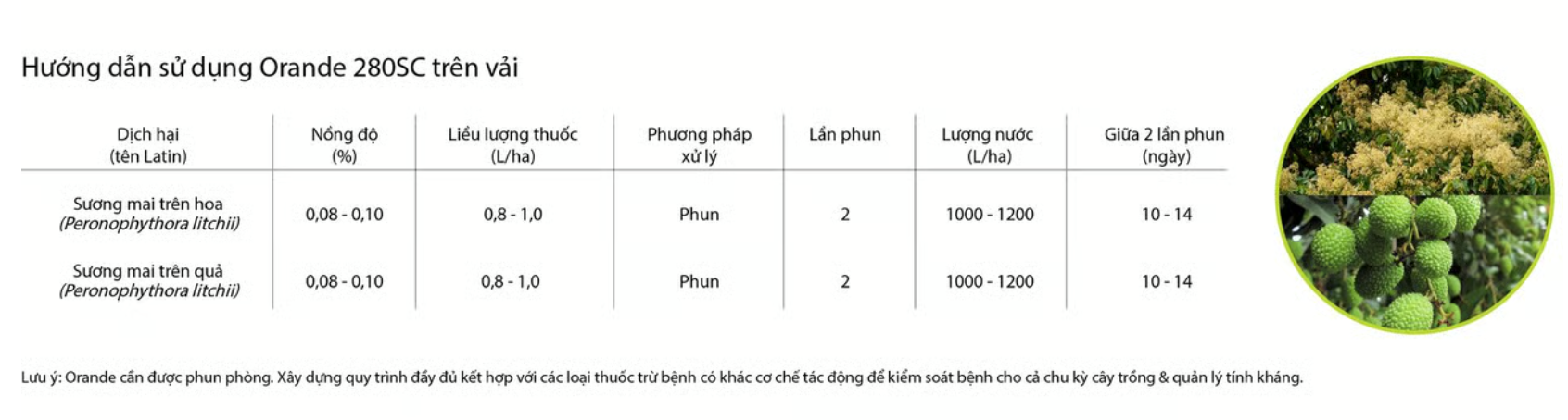 Orande 280SC – một sản phẩm được áp dụng những công nghệ tiên tiến từ Syngenta, với cơ chế tác động độc đáo, đặc trị lớp nấm Oomycetes, mang lại hiệu quả vượt trội trong : – Kiểm soát sương mai hại vải với hiệu lực vượt trội, đặc biệt là giai đoạn ra hoa và đậu quả. – Bảo vệ phần chồi non mới mọc. – Hiệu lực cao và kéo dài. HDSD :