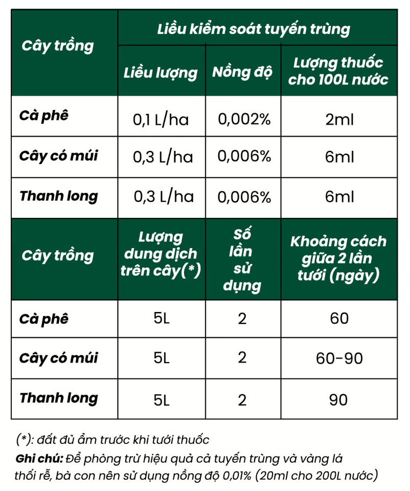 Vaniva® 450SC với công nghệ đột phá TYMIRIUM® tiên tiến nhất, có cơ chế tác động vượt trội giúp diệt sạch truyến trùng trong đất, bảo vệ toàn diện bộ rễ và ngăn chặn nấm bệnh xâm nhập, gây thối rễ cây trồng. Giải pháp bung rễ, bật chồi cực mạnh, hiệu quả cực cao trên nhiều giai đoạn tuyến trùng, kể cả trứng. Ngăn chặn >90% bệnh vàng lá thối rễ Hoạt chất mới với cơ chế tác động đột phá An toàn, hiệu quả kéo dài với liều dùng thấp HDSD :