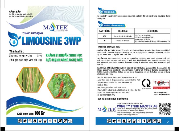 THÀNH PHẦN: Zhongshengmycin: 3% w/w Additives: Vừa đủ 100% w/w HƯỚNG DẪN SỬ DỤNG CÂY TRỒNG: Lúa, ớt, cây trồng khác BỆNH HẠI: – Bạc lá vàng là do vi khuẩn – Đốm là do vi khuẩn – Vi khuẩn, héo xanh, chết cây con LIỀU LƯỢNG 100gr cho 100-200 lít. Lượng nước 500 lít/ha. Phun khi bệnh mới xuất hiện, tỷ lệ bệnh khoảng 5%. – Thời gian cách ly: 5 ngày. HƯỚNG DẪN AN TOÀN CHUNG: ĐỂ XA TẦM VỚI CỦA TRẺ EM. ĐỌC KỸ NHÃN THUỐC TRƯỚC KHI DÙNG. KHÔNG hút thuốc, ăn hoặc uống trong khi sử dụng sản phẩm này. KHI TIẾP XÚC HOẶC CHUẨN BỊ THUỐC: TRÁNH: Hít phải thuốc, để thuốc tiếp xúc với miệng, da và mắt. MANG: Bảo hộ lao động phù hợp. NẾU BỊ DÍNH THUỐC: Ngay lập tức cởi quần áo bị dính thuốc hoặc bắn nhiều thuốc. Rửa kỳ phần bị dính thuốc bằng nhiều nước sạch. SAU KHI SỬ DỤNG: Rửa chân tay và tắm rửa. Rửa sạch trang bị bảo hộ lao động. CẤT GIỮ, SỬ DỤNG VÀ XỬ LÝ BAO GÓI SAU SỬ DỤNG Giữ kín trong bao gói gốc được dân nhân. KHÔNG sử dụng lại bao gói này vì bất kỳ mục đích nào khác. Để bao gói ở nơi an toàn, tránh xa thức ăn, trẻ em và động vật. Bao bì gói sau sử dụng đúng nơi quy định. Bao gói sau sử dụng phải được rửa 3 lần. SƠ CẤP CỨU Thuốc dính vào mắt phải rửa nước sạch ít nhất 15 phút. Nếu nuốt phải thuốc phải đưa ngay bệnh nhân tới bệnh viện gần nhất, kèm theo nhãn thuốc để bác sĩ điều trị theo triệu chứng. THÔNG TIN SẢN XUẤT Nhà sản xuất: Jiangxi Zhengbang Crop Protection Co., Ltd. Add: West side of Xingyun Avenue, Spark Industrial Park, Yongxiu County, Jiujiang City, Jiangxi Province, China. Đơn vị đóng gói: Công ty Cổ Phần Vật Tư Tây Đô Long An. SDK: 7956/CNDKT-BVTV HSD: 2 năm – Ngày SX/ Số lô SX: Xem trên bao bì sản phẩm. Đăng ký nhập khẩu và cung ứng: CÔNG TY TNHH MASTER AG Địa Chỉ: 351/3 An Dương Vương, P. 10, Quận 6, TP. HCM Điện thoại: 028.2226.8179 Fax: 028.3755.8479 05/23/CBHQ-MT.AG