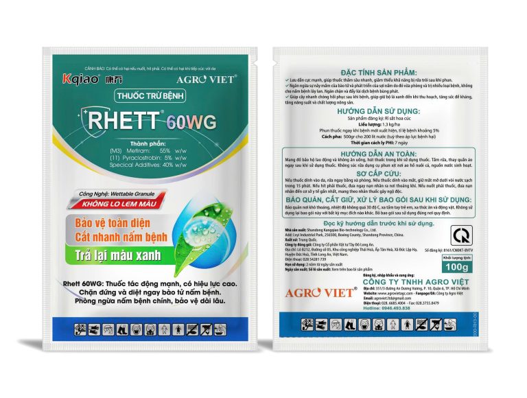 RHETT 60WG là thuốc trừ bệnh cao cấp do AGRO VIET sản xuất, ứng dụng công nghệ hạt hòa tan (Wettable Granule) tiên tiến. Sản phẩm chứa hoạt chất Metiram 55% và Pyraclostrobin 5%, kết hợp phụ gia đặc biệt giúp diệt nhanh bào tử nấm, bảo vệ cây trồng toàn diện và phục hồi màu xanh tự nhiên.